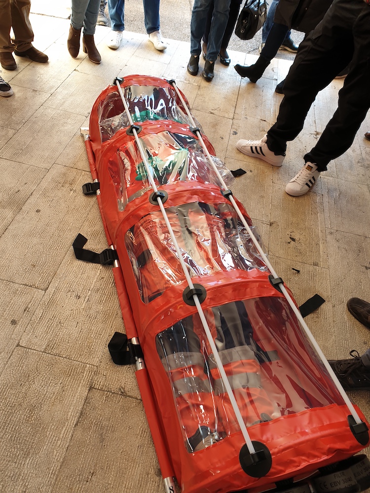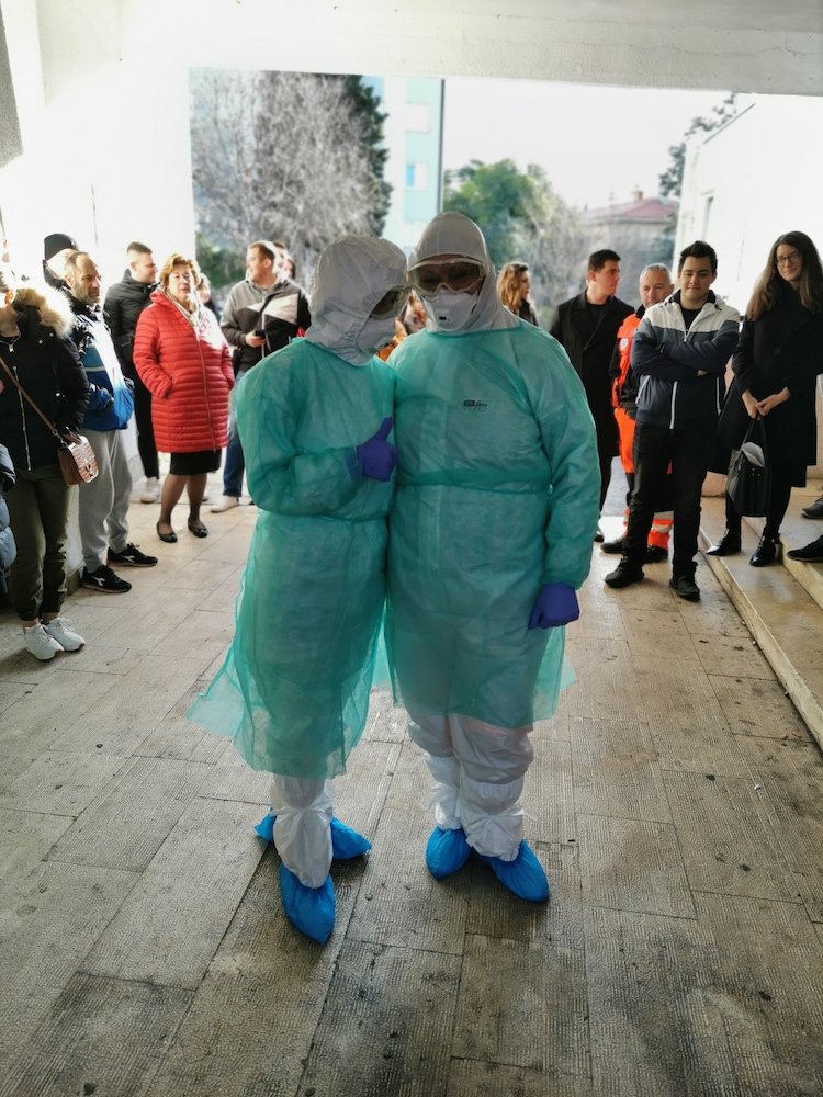 Pri prezentaciji rukovanja sa Bio Bagom (zaštitnom kapsulom za transport visoko rizičnog zaraženog pacijenta) kao i načinu oblačenja i svlačenja zaštitne opreme za djelatnike asistirale su i nacionalne instruktorice Zavoda Senka Kajčić, dr.med. i Emilija Lazarević, mag.educ.rehab.