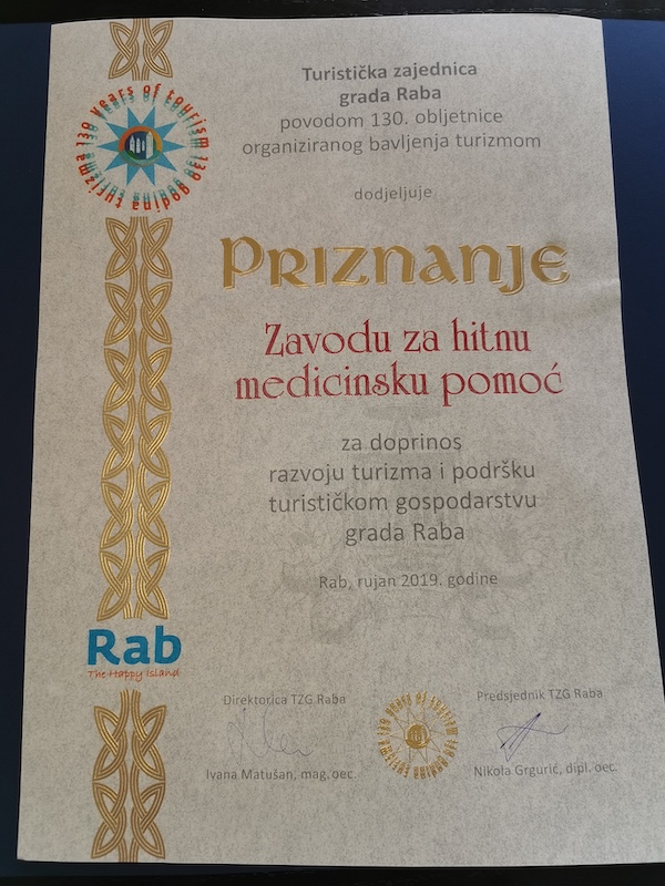 Tom prigodom je i Zavod za hitnu medicinu PGŽ dobio Priznanje za doprinos razvoju turizma i podršku turističkom gospodarstvu Grada Raba.